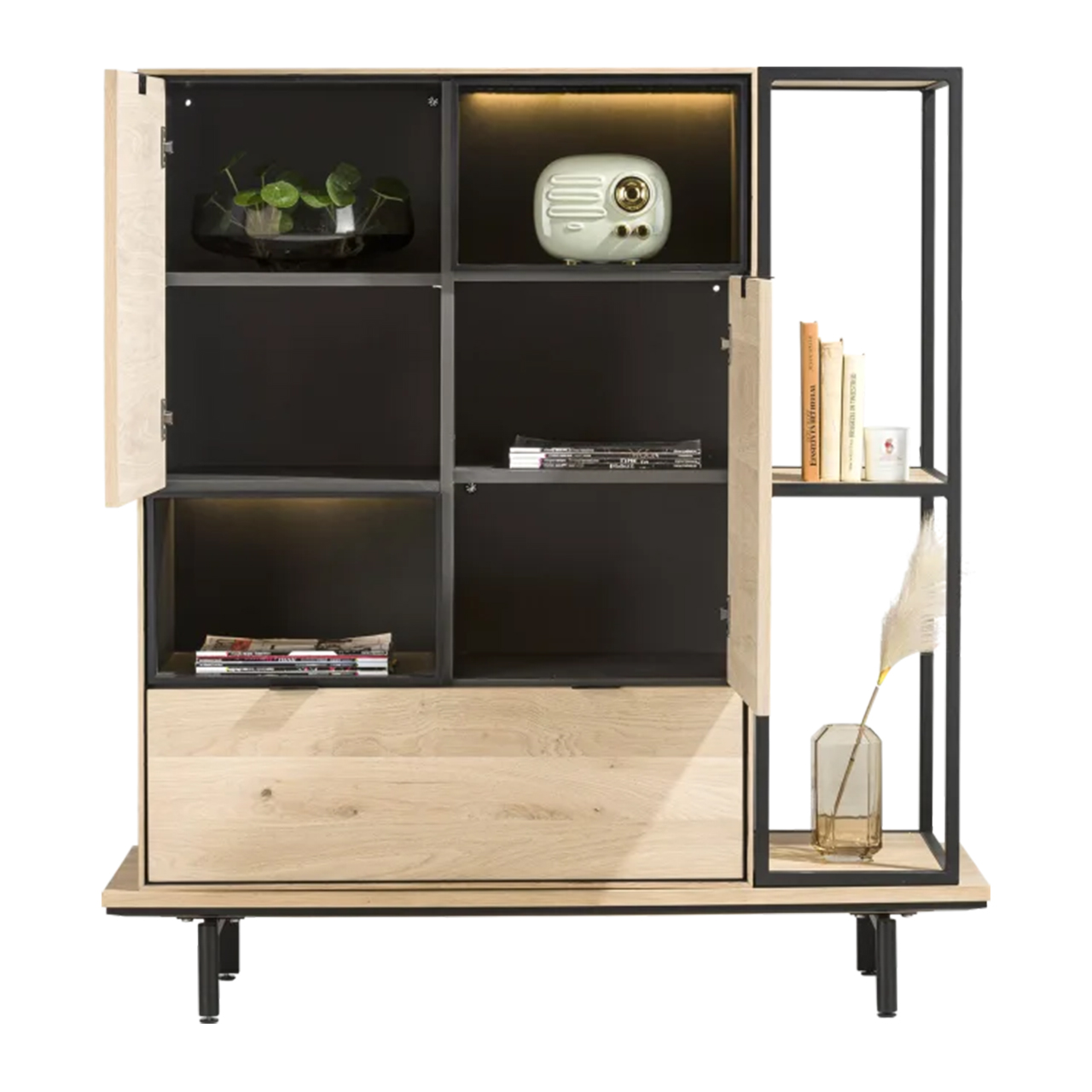 Habufa Highboard Pantin – Industrieller Look mit warmer HolzoptikDas Habufa Highboard Pantin vereint modernes Industriedesign mit der warmen Ausstrahlung von charaktervollem Holz. Mit seinen Maßen von 120 x 140 x 42 cm ist es kompakt, bietet aber gleichzeitig großzügigen Stauraum für Wohn- und Essbereiche.Gefertigt aus HPL in Barnwood-Optik und kombiniert mit einem pulverbeschichteten schwarzen Metallgestell, strahlt es Robustheit und Eleganz zugleich aus. Die hochwertige Verarbeitung sorgt dafür, dass dieses Highboard nicht nur optisch, sondern auch funktional überzeugt.Hinter einer Tür und in zwei Schubladen lassen sich Utensilien ordentlich verstauen, während die sieben offenen Nischen dekorativen Objekten einen besonderen Platz bieten. Ein echtes Highlight ist die integrierte LED-Beleuchtung, die die offenen Fächer stimmungsvoll in Szene setzt und für ein wohnliches Ambiente sorgt.Mit seinem Mix aus Stauraum und offenen Präsentationsflächen passt das Highboard Pantin perfekt in moderne, industrielle und gemütlich-natürliche Wohnstile. Es ist ein Blickfang, der praktischen Nutzen und stilvolles Design harmonisch vereint.ONLINE ONLY(Dieser Artikel ist nur online bestellbar. Das Produkt ist nicht im Geschäft ausgestellt oder lagernd.)