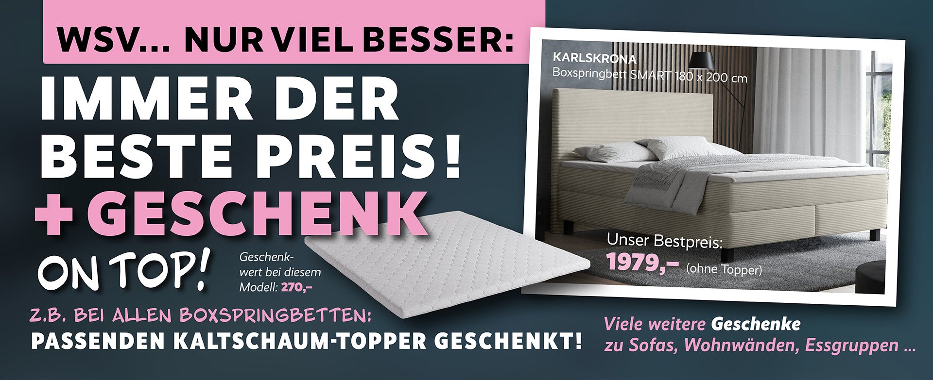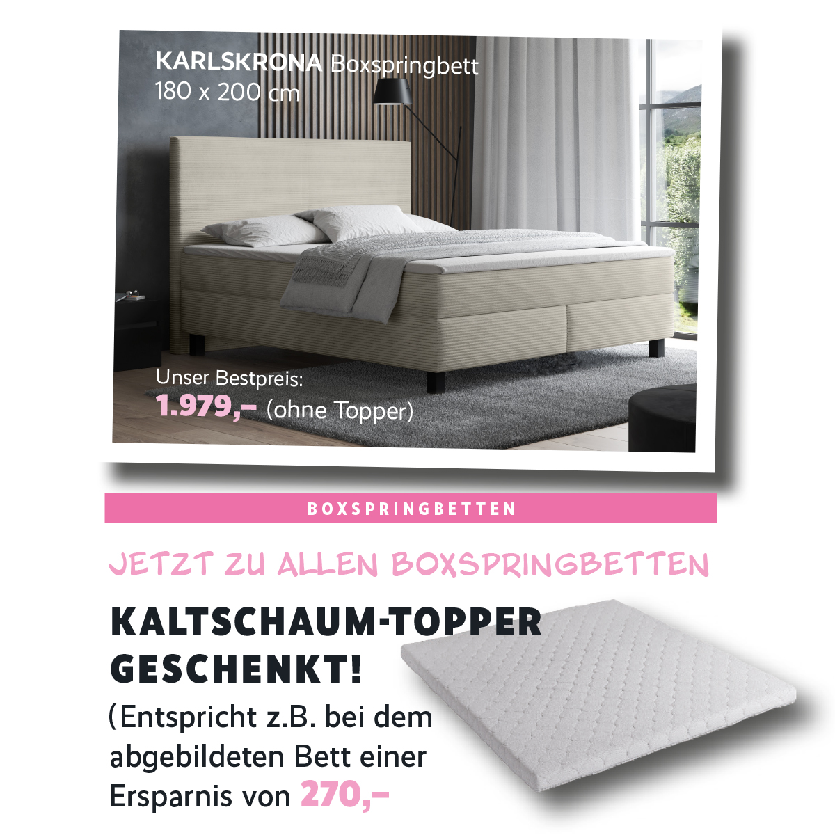 Guter Schlaf verändert alles. Wenn du dich für ein Boxspringbett entscheidest, schenken wir dir einen passenden Kaltschaum-Topper dazu. Für spürbar mehr Liegekomfort und erholsame Nächte – Nacht für Nacht.
