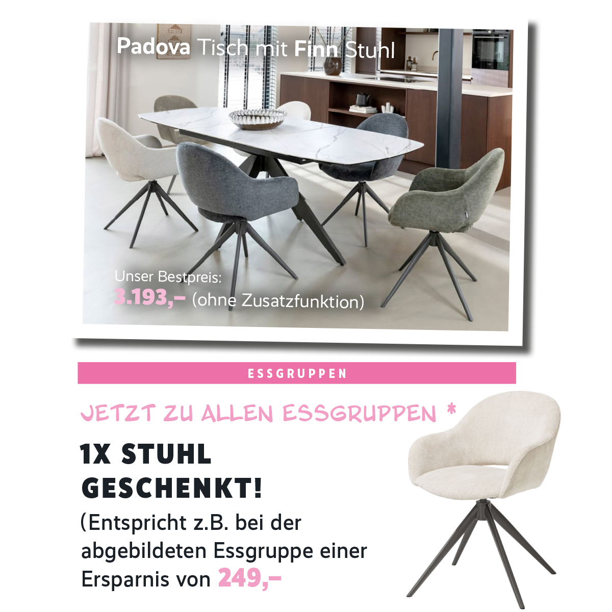 Hier wird gegessen, geredet, gelacht – und oft länger gesessen als geplant. Beim Kauf einer Essgruppe (Tisch + mindestens 4 Stühle) schenken wir dir den günstigsten Stuhl deiner Auswahl 1x gratis. Mehr Platz für Familie, Freunde und schöne Momente.