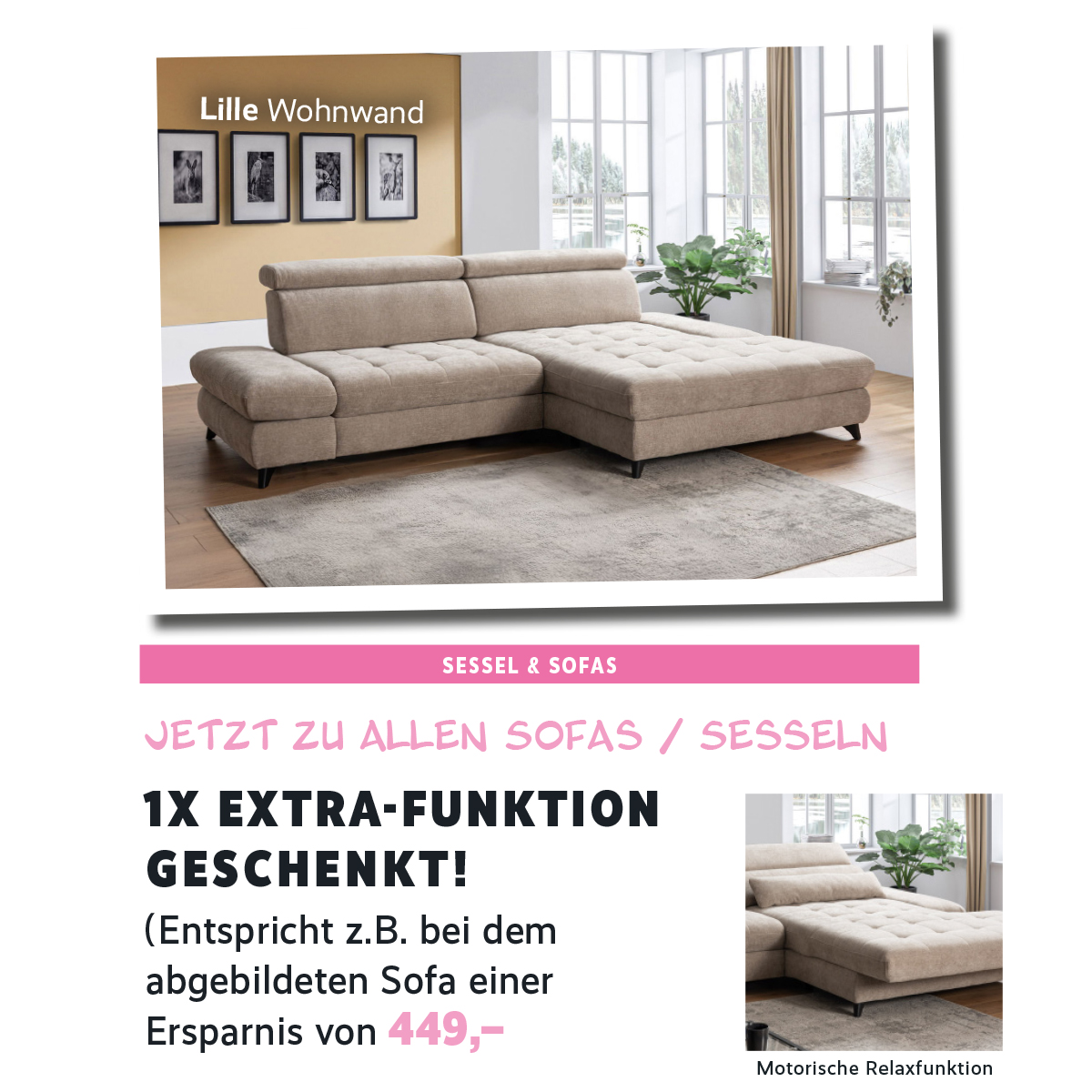 Stell dir vor: Feierabend, Füße hoch, einfach ankommen. Genau dafür ist dein neues Sofa da. Beim Neukauf eines Sofas, Sessels oder einer Polstergarnitur ab 2.249 € schenken wir dir eine Zusatzfunktion im Wert von bis zu 850 €. Mehr Komfort, mehr Entspannung – und das ganz ohne Aufpreis.